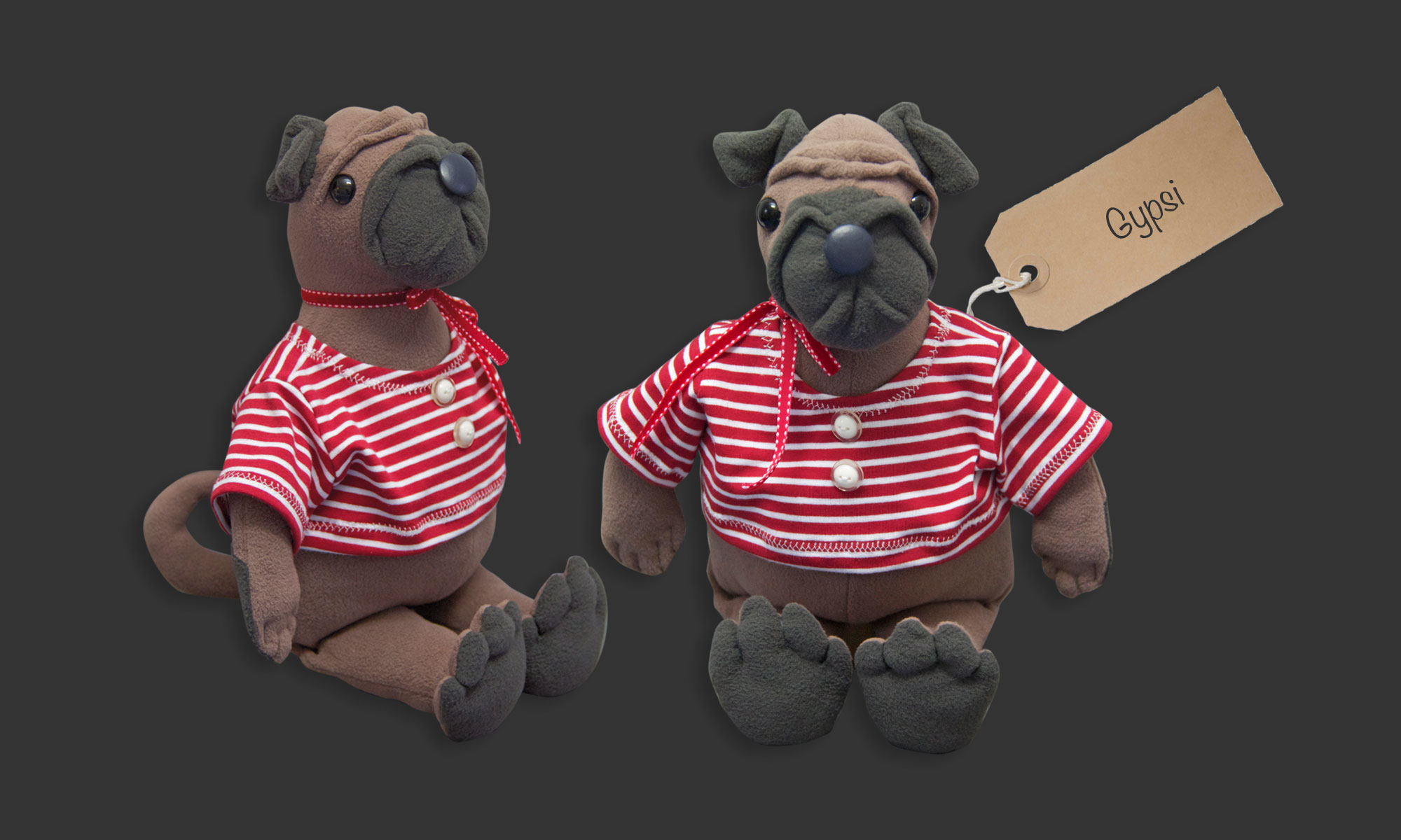 Mops Teddy, Bruno, Gypsi (Muster, vergriffen) Höhe: ca. 31 cm Verwendete Materialien Körper: kuscheliger Microfleece Füllung: Füllwatte Polyester Kleidung: Baumwolle Jersey Besonderheiten: Kleidung ausziehbar contact@creazon.pe