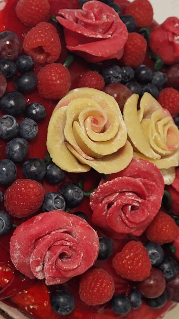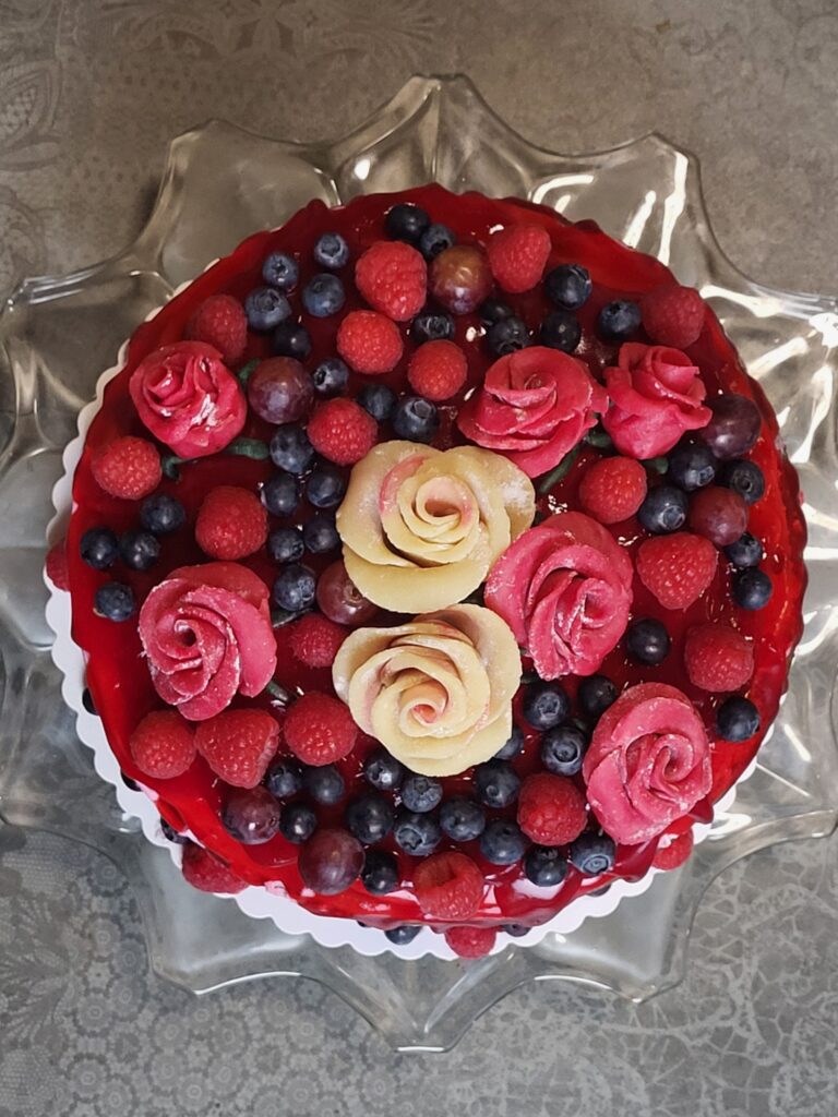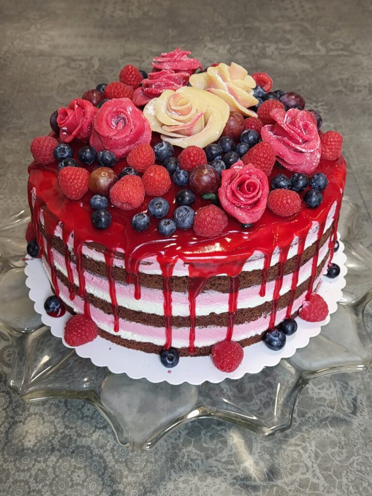 Köstliche Himbeer-Schichttorte aus Schokobiskuit abwechselnd gefüllt mit Mascarponesahnecreme Natur und Himbeercreme. Himbeerfruchtdrip, frische Beeren und handgemachte Marzipanrosen geben der Torte den richtigen Schliff!